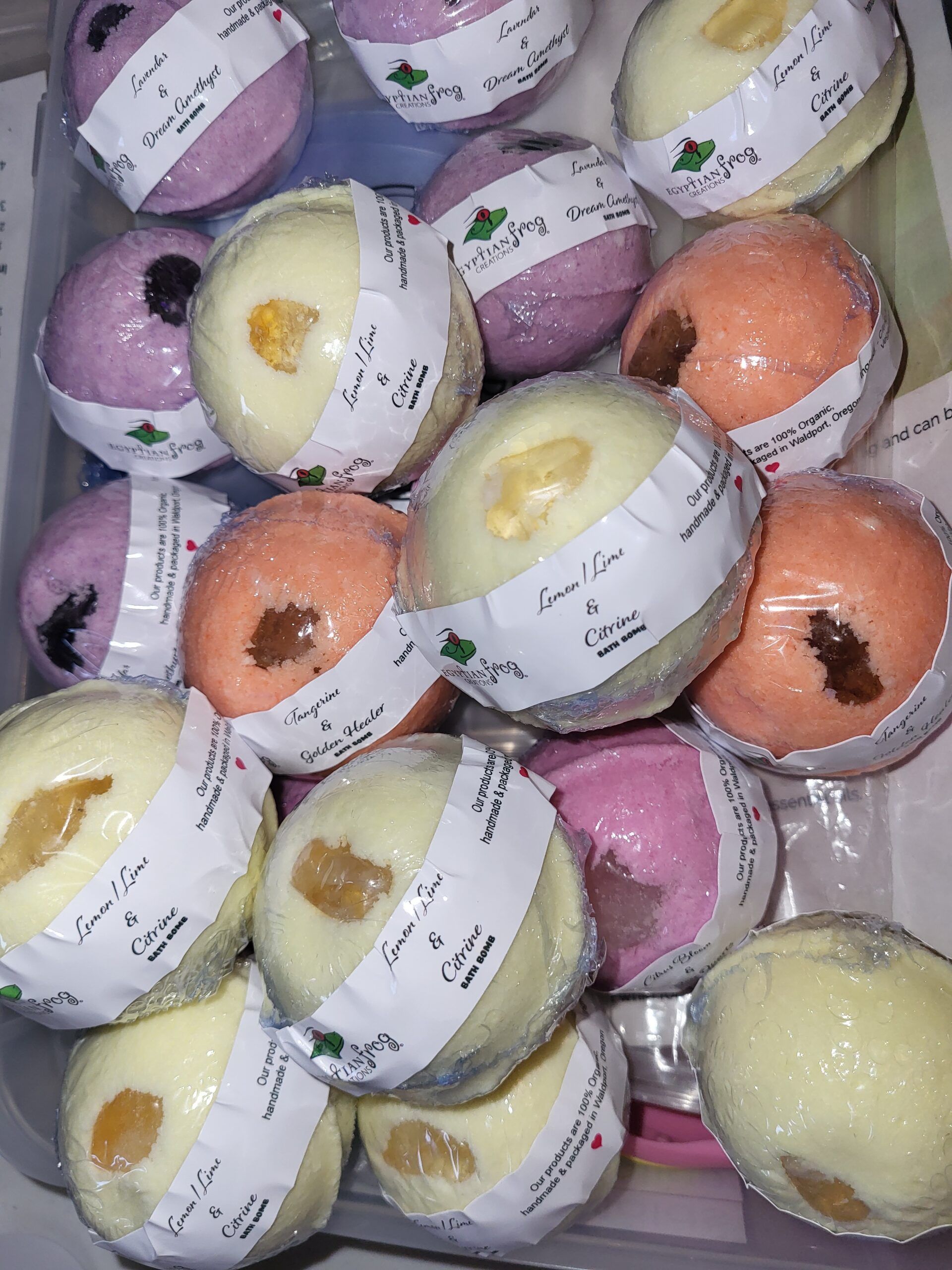 Luscious Foaming Bath Bombs with healing crystals made with Citric Acid, Baking Soda, Cornstarch,